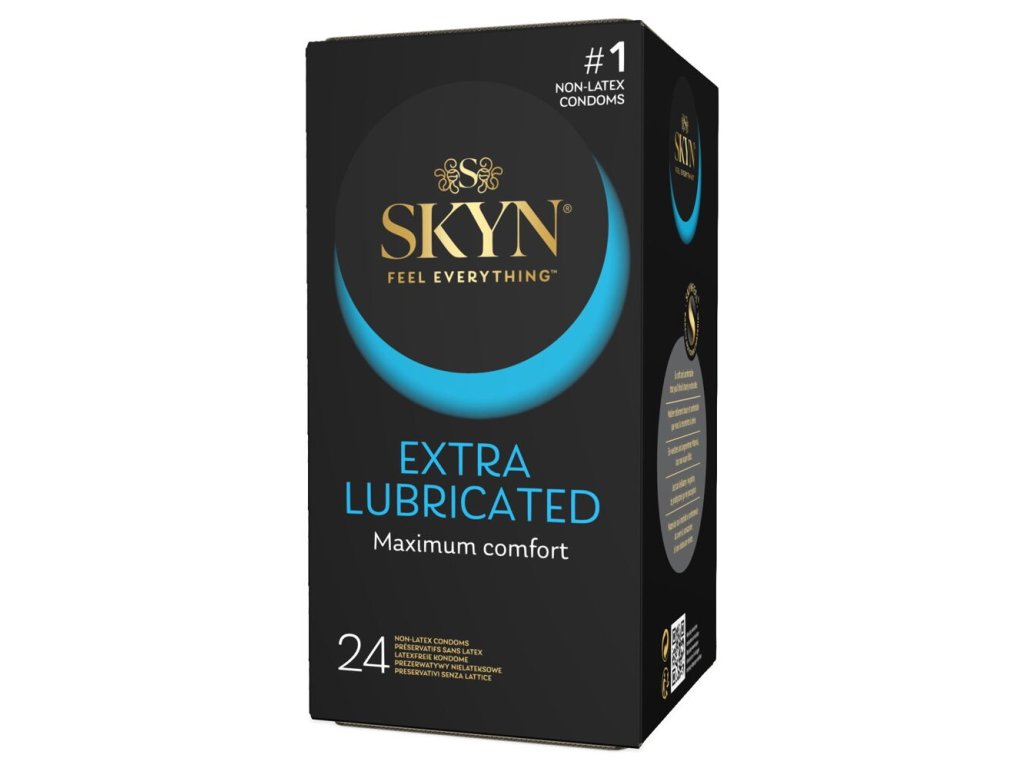 Priehľadné, extra tenké kondómy **SKYN Extra Lubricated** sú potiahnuté o 40 % väčším množstvom silikónového lubrikantu pre jemný a zmyselný pôžitok. Vyrobené zo sensoprenu (polizoprénu), vďaka čomu sú mäkké, pružné a pôsobia veľmi prirodzene. Neobsahujú latex ani zápach – ideálne pre ľudí s alergiou alebo citlivosťou na latex.