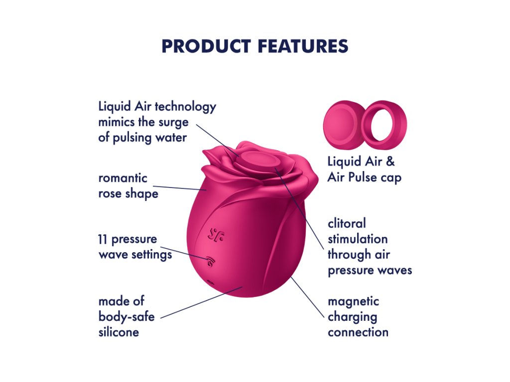 Krásny Satisfyer Pro 2 Classic Blossom v sebe spája romantickú, nadčasovú eleganciu s inovatívnou technológiou ako žiadna iná milostná hračka. Vibrátor tlakových vĺn v očarujúcom dizajne ruže ťa nielen rozmazná bezdotykovými tlakovými vlnami, ktoré umožňujú pocit pruženia klitorisu. Nie, táto ruža dokáže ešte viac: Vyber si extra nadstavec Liquid Air a uži si inováciu, ktorá nemá konkurenciu. Zaži obzvlášť intenzívny typ stimulácie klitorisu, pretože prelomová technológia Liquid Air Technology s tenkou silikónovou membránou napodobňuje pocit pulzujúceho prúdu vody. Výsledok: mimoriadne uspokojujúce pocity rozkoše! K dispozícii máš 11 programov tlakových vĺn – bez ohľadu na to, ktorý nadstavec si vyberieš.